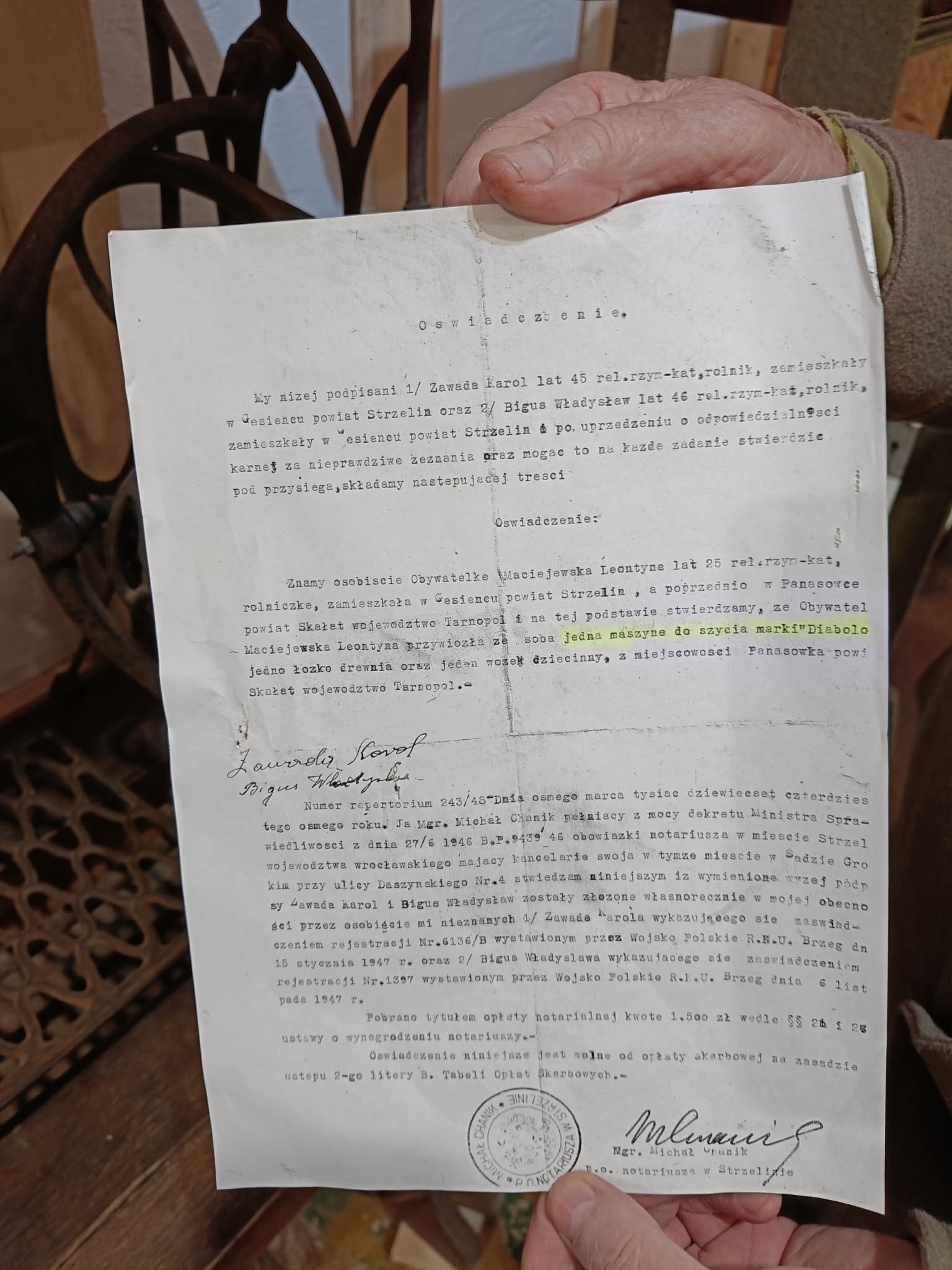 In 1946 they came to Lower Silesia. The most valuable thing they brought with them was the sewing machine, which proved extremely useful in those difficult post-war years. There were days when our room—because we had only a room with a kitchen—was completely covered with scraps of fabric, threads from removed basting stitches, buttons, and all sorts of other things. On such days I had no access to the machine. When my mother was busy with something else, I would sit on the pedal that powered it and try to swing on it. It never worked very well, because the frame of the stand always got in the way.