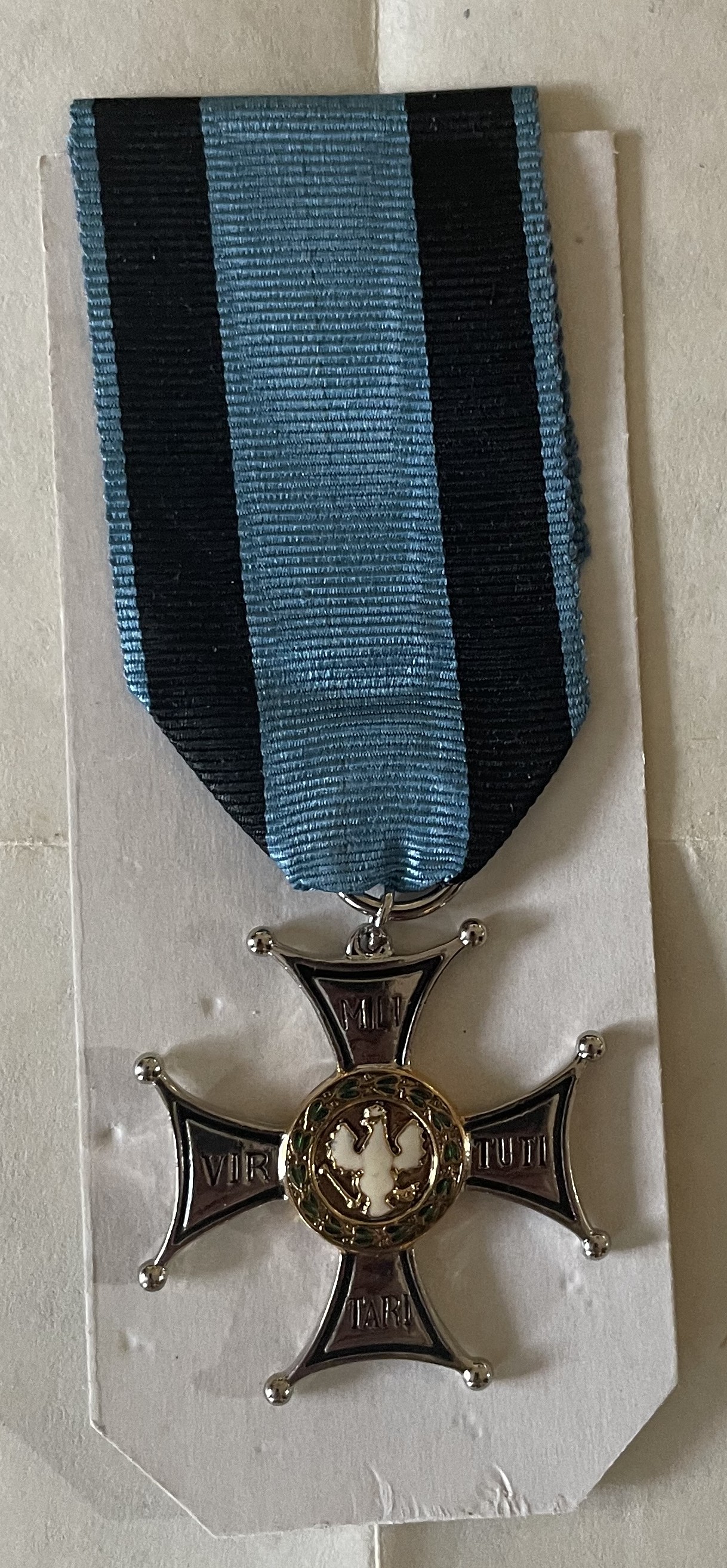 I learned from my father that the owner of these treasures was our ancestor, Teodor Wojciech Hoffmann, codenamed "Bugaj." I was surprised by how much Wikipedia had written about him. He was a war hero, one of 316 soldiers from the elite “Cichociemni” unit, who were parachuted into various sabotage operations in occupied Poland during the World War II. Uncle Wojtek, as he is known in the family, was a communications officer in the Home Army (in Polish: Armia Krajowa), trained for special duties by the Special Operations Executive mainly in Scotland. He spent four years during World War II in Great Britain, and in 1944, during a military operation in Poland, he was wounded in the leg. He remained incapacitated for the rest of his life. For his wartime heroism, he was awarded the Silver Cross of the Virtuti Militari, which is kept by my father's uncle, who lives in Canada. I got the photo of this military decoration from him, via e-mail.