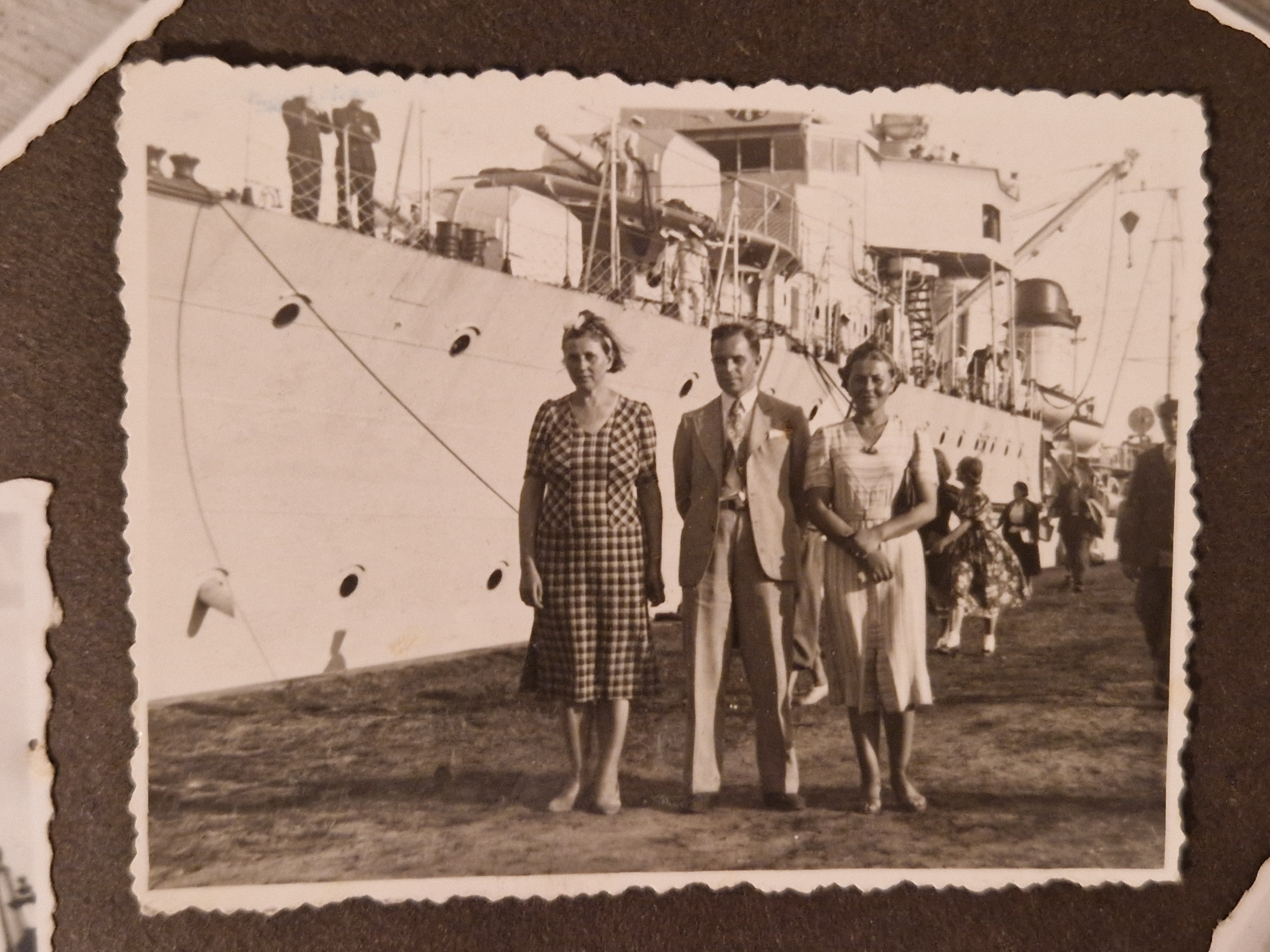During the interwar period, he worked as a lawyer and manager in the judiciary, government, and banking sector. From 1935 to 1939, he served as director of the Bank Gospodarstwa Krajowego (the National Development Bank). The other two photographs come from that time. In one of them, he stands on a harbor with a warship visible in the background. It is difficult to tell where this photograph was taken. The last photo shows him together with his wife – my great-great-grandmother Helena – among a group of elegantly dressed people. In the background, we can see the railings of a ship and the sea. On the back of the photo, it says: “Photo taken on the day of Wojtek’s baptism, 25.09.1938” and there is a stamp reading “Foto Elite Gdynia.”