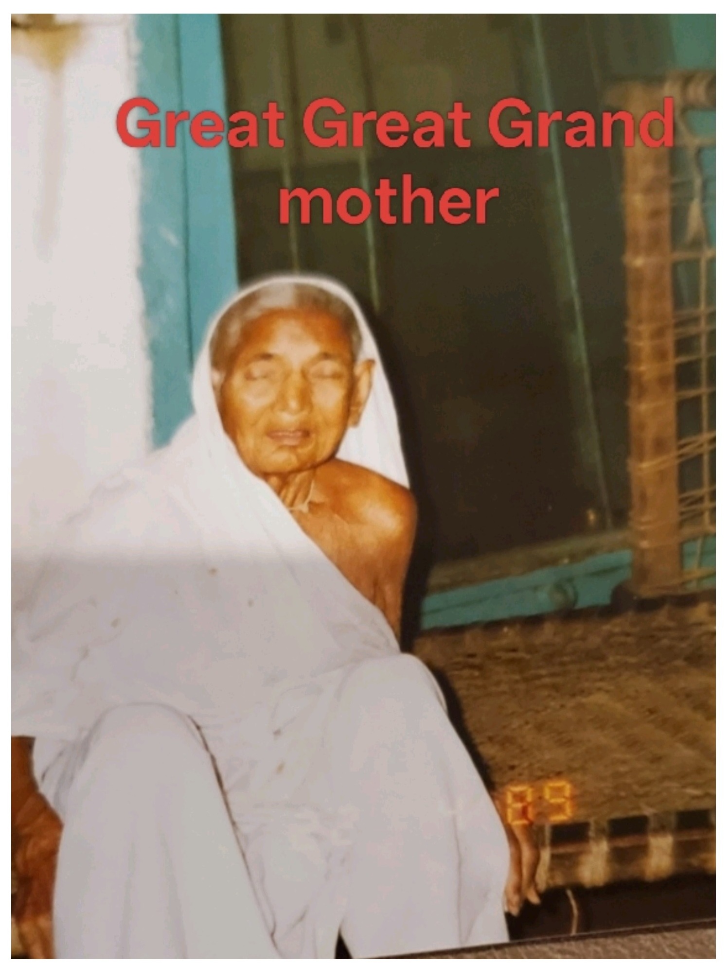 The first picture is of my late great grandmother with my mother and her cousins on the terrace of the house. This picture is the reflection of the algorithm of family and the bonding with grandparents and cousins. A unique reflection of the charm of joint families. I could feel the concept of joint families, which was an integral part of Indian tradition. Now we are aping the west, but the beauty of our roots makes me lonely in this distant land. My mother tells me that she and her cousins in those days played games like Tag and Hide and Seek on the terrace of the house. From this, I learned that family times were cherished merrily at that time. This photo is also a reflection of an era gone by. Though my great grandmother has died, she has still left her footprints in the sands of time.