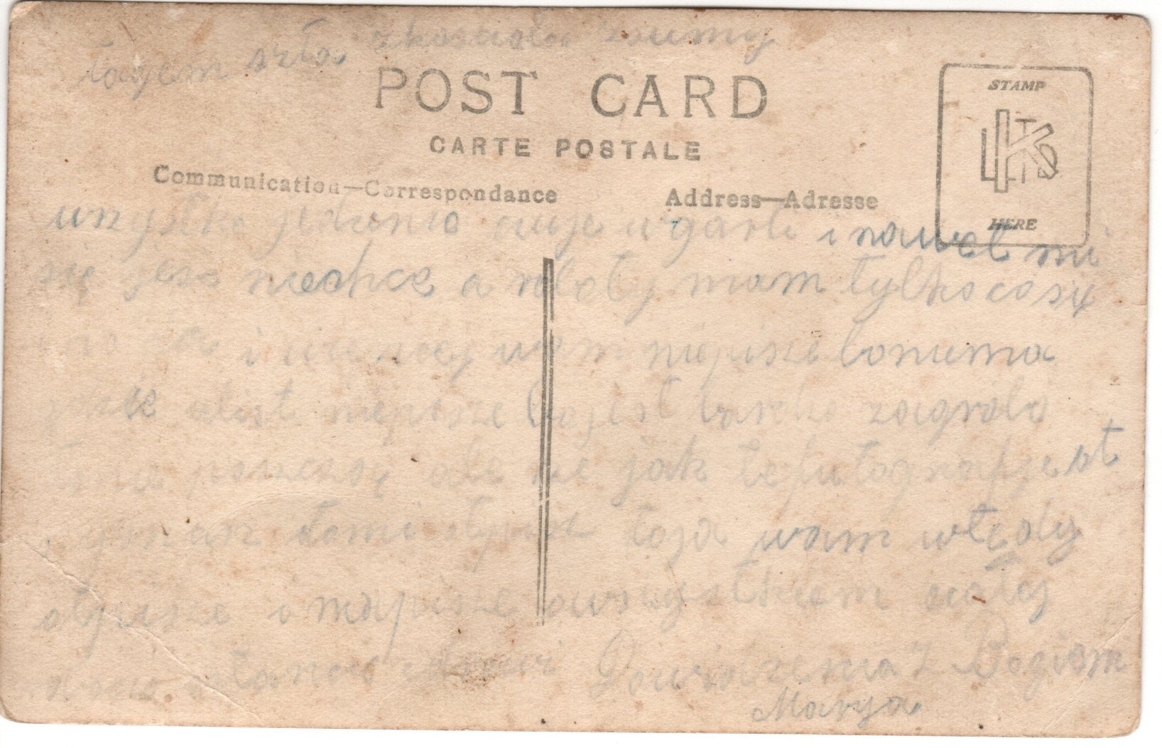 Maria chose France. She travelled alone. Her daughter was left in Tuligłowy in the care of her brother’s family. Women with children had little chance of finding work. Moreover, it was impossible for many adults to survive such a travel, let alone a toddler. Surely, it was not an easy decision. While in France, Maria wrote: „I feel all the food in my throat and I do not even want to eat (…)”. Further, she mentioned that she had found the job, but that it did not involve many responsibilities. Probably not enough to keep her mind occupied and stop her from thinking about home. Her longing was even stronger as she could not contact her family in the way she wished: „(…) I am not writing more here, because there is no space. I will not write a letter, as it would be too thick and I would not send it, unlike this photograph (…)”. Sending a single postcard was simply cheaper than sending a letter, but it still gave a glimmer of hope for the addressees. However, Maria promised to send a longer message soon, in which she would describe her work. There was not even enough space for the last sentence, so Maria finished it at the top of the postcard. She explained that the photo on the back was taken at the church’s door after Sunday Mass. Just one short phase, but one that says a lot. In this light, her old-fashioned clothes become a festive clothing. The item in her left hand is undoubtedly a prayer book, and the object behind her begins to resemble a baptismal font.