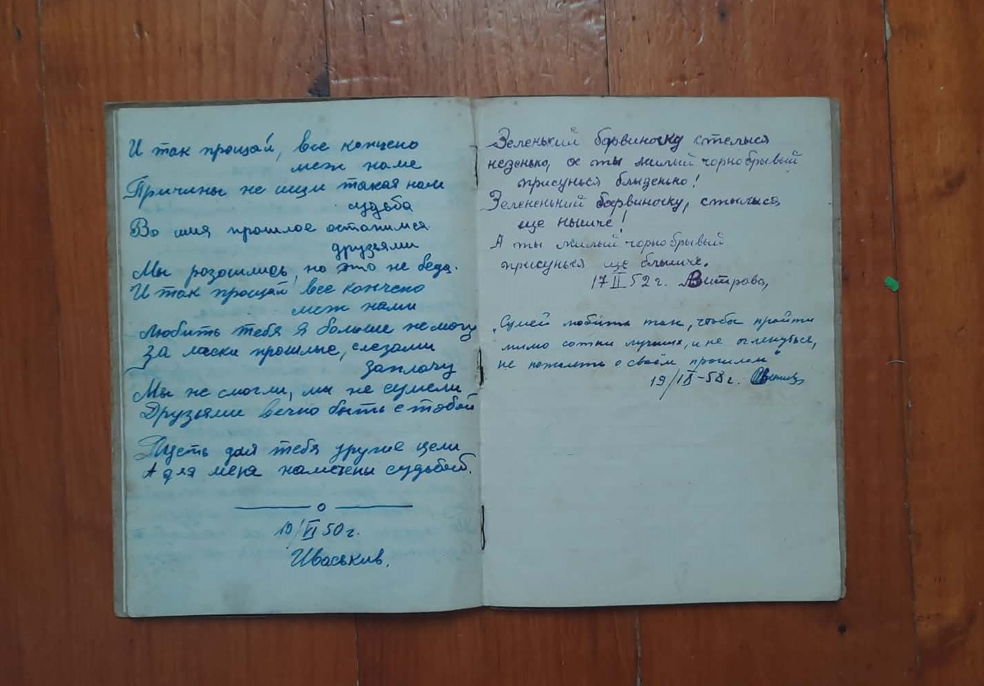 They say that very few family relics have been preserved among Ukrainians because, due to the Soviet occupation, the artificial famine (Holodomor), and repressions, people were forced to exchange them for bread or lost them during forced migrations. However, I am fortunate because a memento of my great-grandfather (my mother's grandfather) – Yevstakhiy Ivaskiv – has been preserved in our family archive. It is my great-grandfather's notebook, dated 1950, where in his youth he wrote down various quotes about love, as well as songs popular among the youth of that time. Written neatly in ink on it is: «An album for the long-standing memory of young life, compiled in the Russian language. Omsk, Molotovsky district, Palatochnyi horodok,32». Below is the date: April 12, 1950, and a signature.
