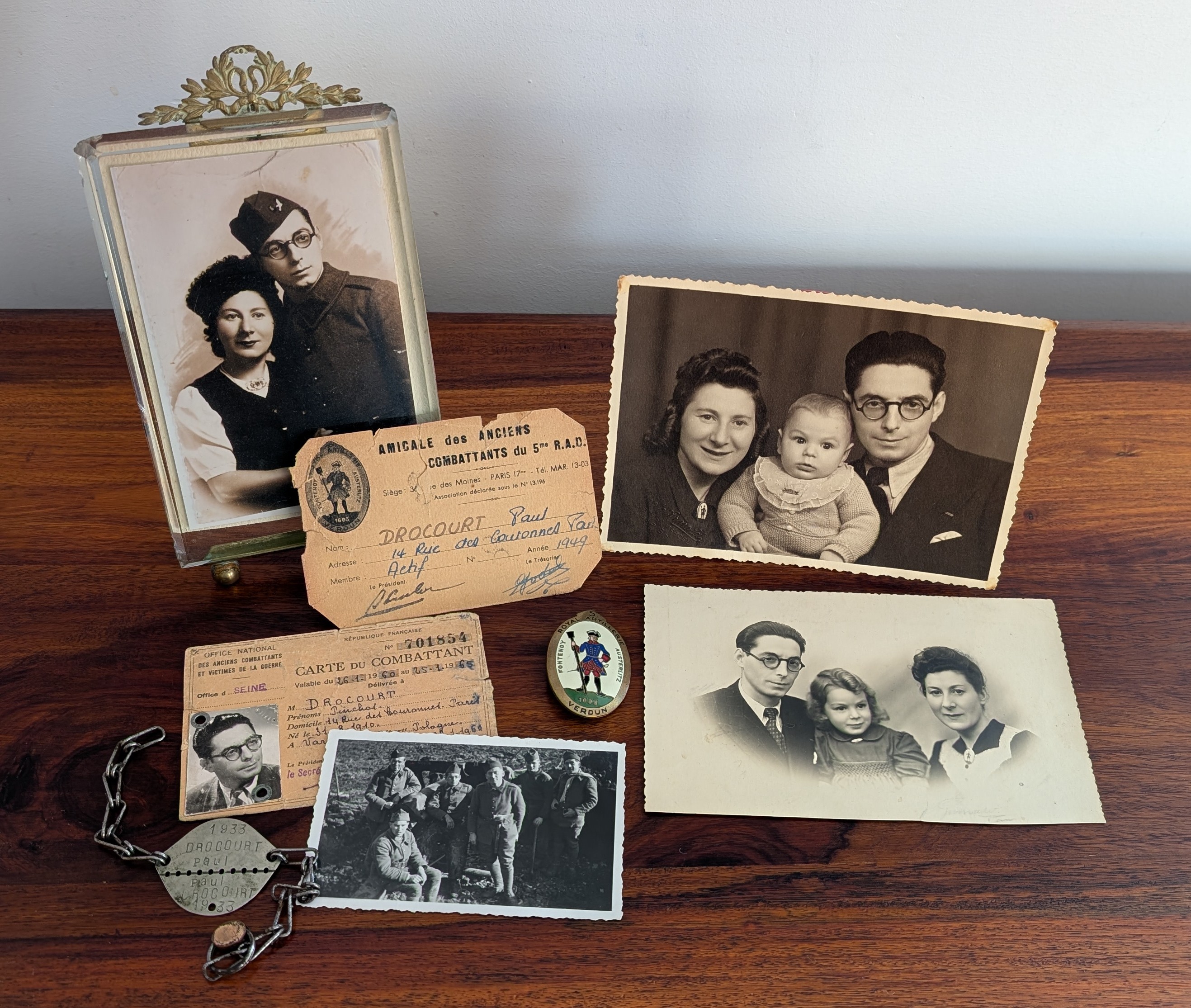I now cherish this brooch. I don’t wear it of course, but I watch it every day : it sits on my desk, close to the frame with my favourite photo from 1940 : grandpa proudly standing in his French army uniform holding grandma, both tenderly looking at me through time.