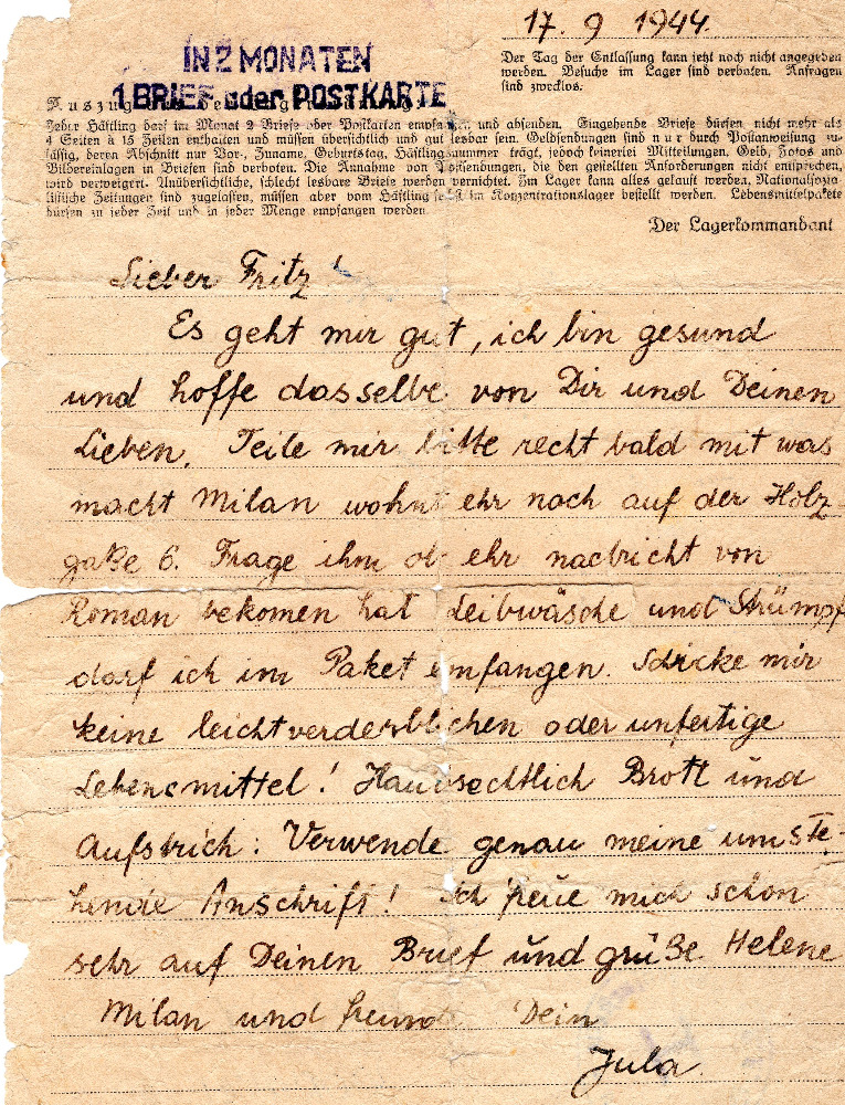 Julius sent a postcard on March 25, 1944, from the Auschwitz-Birkenau concentration camp and later, on September 17, 1944, from the Sachsenhausen concentration camp. I am enclosing these postcards.