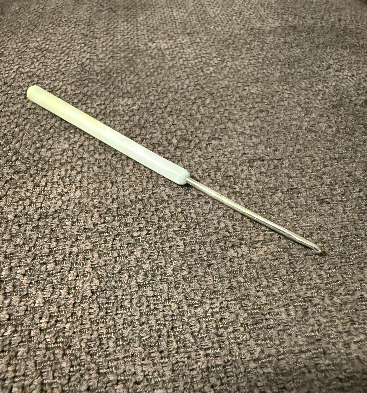 Hello! I am Amelie, and today I will present you with my crochet story. But first, I will describe the object to you. The crochet hook is made from plastic and metal. The crochet hook is bent, and the metal part is a little bit crooked. It is thin. The colour of the metal is gray and the plastic is turquoise. The length of the metal part is 4,4 centimeters, and the plastic part is 8,4 centimeters. The total length of the crochet is 12,8 centimeters.